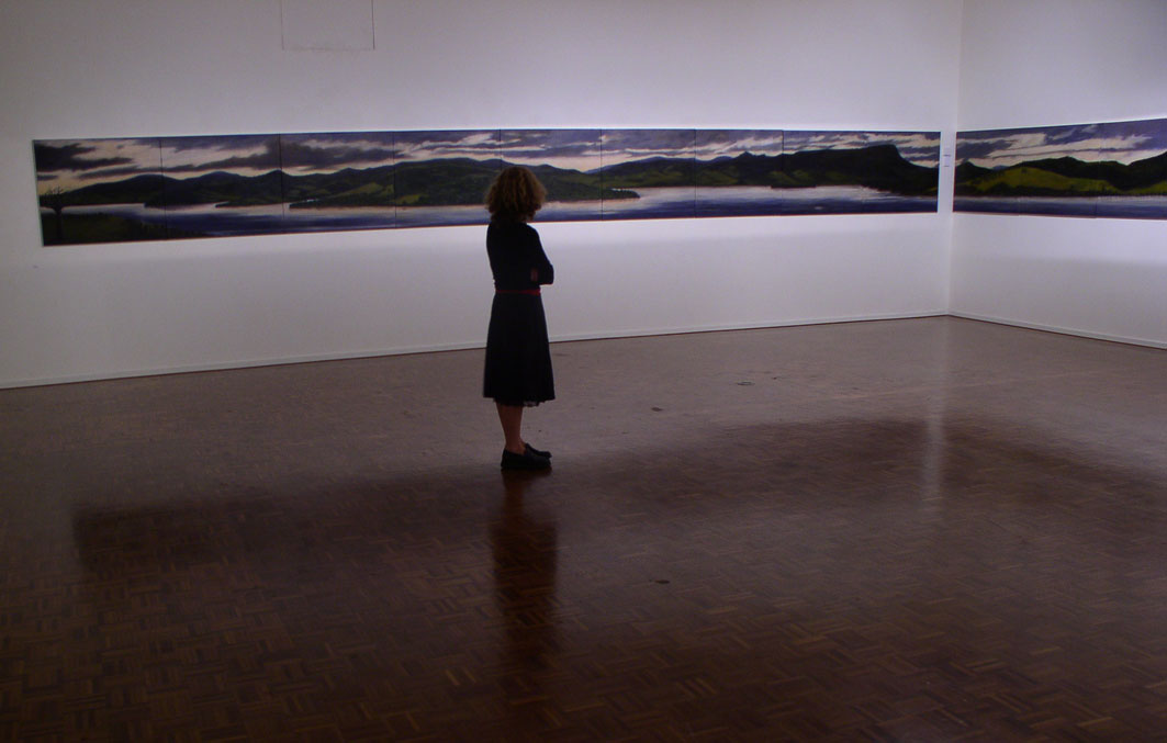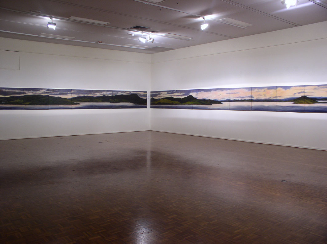 This panoramic installation is an experiential work in two ways. Firstly, in that it surrounds and involves the viewer in the illusion of a specific environment and terrain, allowing the eye to survey a large area and gain a sense of both being in and moving through space. The continuous multiple panels that wrap around the walls of the gallery represent the journey one would experience when walking around the northern tip of this Island.