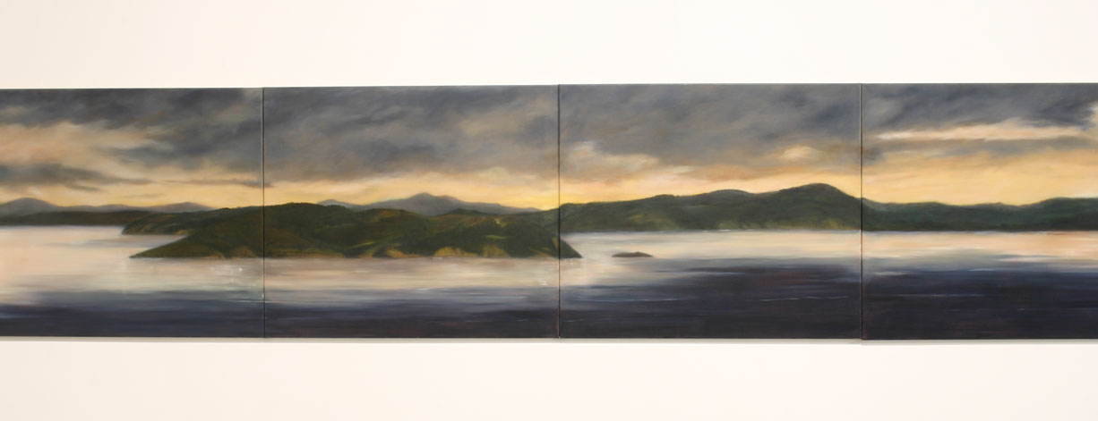 As the viewer follows the panels, a secondary journey takes place. From the early light of dawn to the evening twilight which is synonymous with this southerly latitude of forty degrees south, the painting encompasses the passage of a day .Circumnavigating the Island is a place of dark, melancholic beauty, effectively capturing the brooding atmosphere, light and colour of this region.